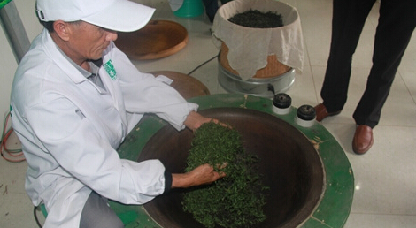 技術(shù)農(nóng)民在專業(yè)合作社內(nèi)手工炒茶。