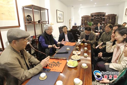 1月15日下午,由廣州市文聯(lián)和289藝術(shù)園區主辦的首場(chǎng)“大師下午茶”在廣州文藝市民空間舉行。廣州市美術(shù)家協(xié)會(huì )主席、廣州市書(shū)法家協(xié)會(huì )副主席周?chē)莵?lái)到現場(chǎng),與廣州市民進(jìn)行藝術(shù)人生與藝術(shù)百態(tài)的交流。