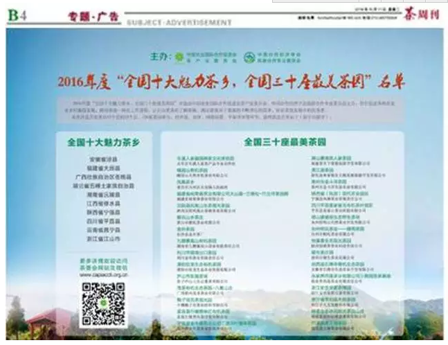 今年夏天,由中國農業(yè)國際合作促進(jìn)會(huì )茶產(chǎn)業(yè)委員會(huì )、中國合作經(jīng)濟學(xué)會(huì )旅游合作專(zhuān)業(yè)委員會(huì )共同發(fā)起2017年度“全國十大魅力茶鄉、全國三十座最美茶園”評選活動(dòng)將再度上演。