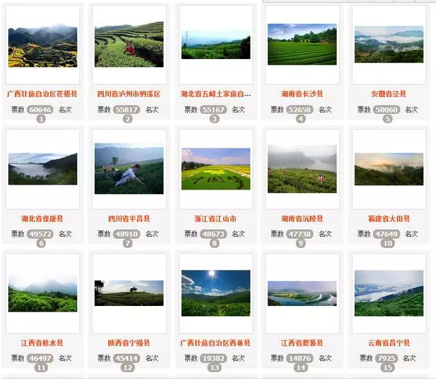 31個(gè)茶鄉,122家茶園,這是2016年度“全國十大魅力茶鄉”“全國三十座最美茶園”網(wǎng)絡(luò )評選活動(dòng)的參評單位。而在短短的20天內,活動(dòng)共吸引了90多萬(wàn)茶友參與評審環(huán)節,服務(wù)器多次被擠爆,平均每個(gè)參評單位都有近6000的支持率,留言頁(yè)面共計1322千頁(yè)。