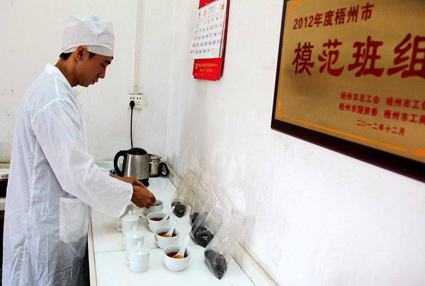 梧州中茶的質(zhì)檢員對茶葉進(jìn)行開(kāi)湯審評