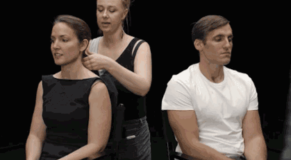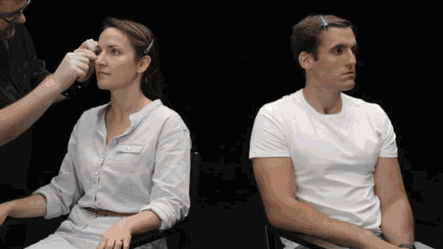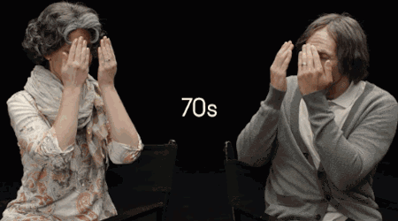 化妝成70歲時(shí)候的樣子,當他們放下雙手看到彼此的時(shí)候,雖然還是面帶笑容,但顯然被面前這個(gè)皺紋滿(mǎn)面、頭發(fā)花白的老人嚇了一跳。