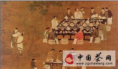 宋徽宗《文會(huì )圖》,是公認的描繪茶宴的佳作,展現出宋代文士雅集的典型場(chǎng)景。整個(gè)活動(dòng)在一處寬敞而幽雅的庭院中進(jìn)行,隨處可見(jiàn)池水、山石、綠樹(shù)等景物。巨大的長(cháng)方形宴會(huì )桌設在樹(shù)蔭之下,黑漆桌面上鑲嵌精美的貝雕花紋,桌案四周設有青竹編織的座墩,上有錦墊,桌上擺有8盤(pán)豐盛的珍饈,6瓶插花。出席宴會(huì )的都是文士或官員,共l1人,個(gè)個(gè)神采奕奕。主人席位單獨設在上首,對應的下首設兩席,兩側各設四席。在開(kāi)宴之前每位席前已放置一個(gè)高腳帶托酒杯和一雙牙箸。
