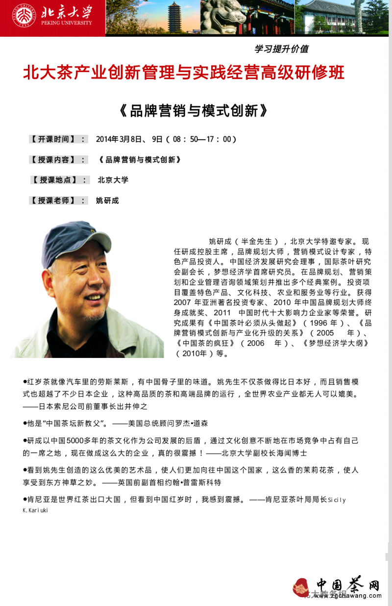 為探討茶企業(yè)如樹(shù)立品牌形象,借助北京大學(xué)茶產(chǎn)業(yè)高級研修班邀請到了品牌規劃大師,營(yíng)銷(xiāo)模式設計專(zhuān)家,姚研成老師與同學(xué)們探討紅歲茶品牌的戰略策劃。“北京大學(xué)茶產(chǎn)業(yè)創(chuàng )新管理與實(shí)踐經(jīng)營(yíng)高級研修班——品牌營(yíng)銷(xiāo)與模式創(chuàng )新”于2014年3月8日-9日在北京大學(xué)舉辦?! ?