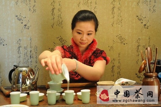 六、奉茶:將茶壺內所泡的茶完全倒于茶海中使茶色、茶味均衡并沈淀雜質(zhì)。將茶倒入聞香杯中約七分滿(mǎn),或用扣杯的方式,正面圖樣對正面圖像,倒過(guò)來(lái)奉茶增添品茶的樂(lè )趣(基于衛生考慮,扣杯的方式只適用于第一泡)。